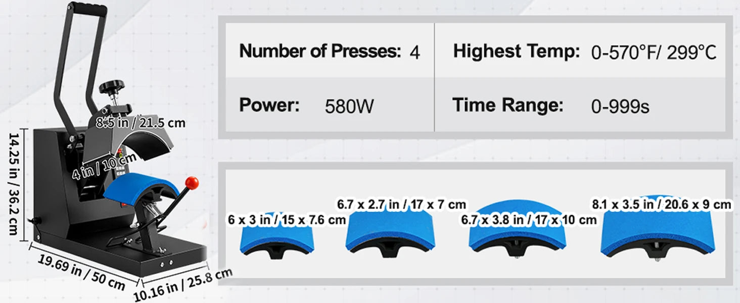 SucceBuy Hat Heat Press 4 in1 Cap Heat Press Machine 6x3inches Clamshell Transfer LCD Digital Timer Temperature Control